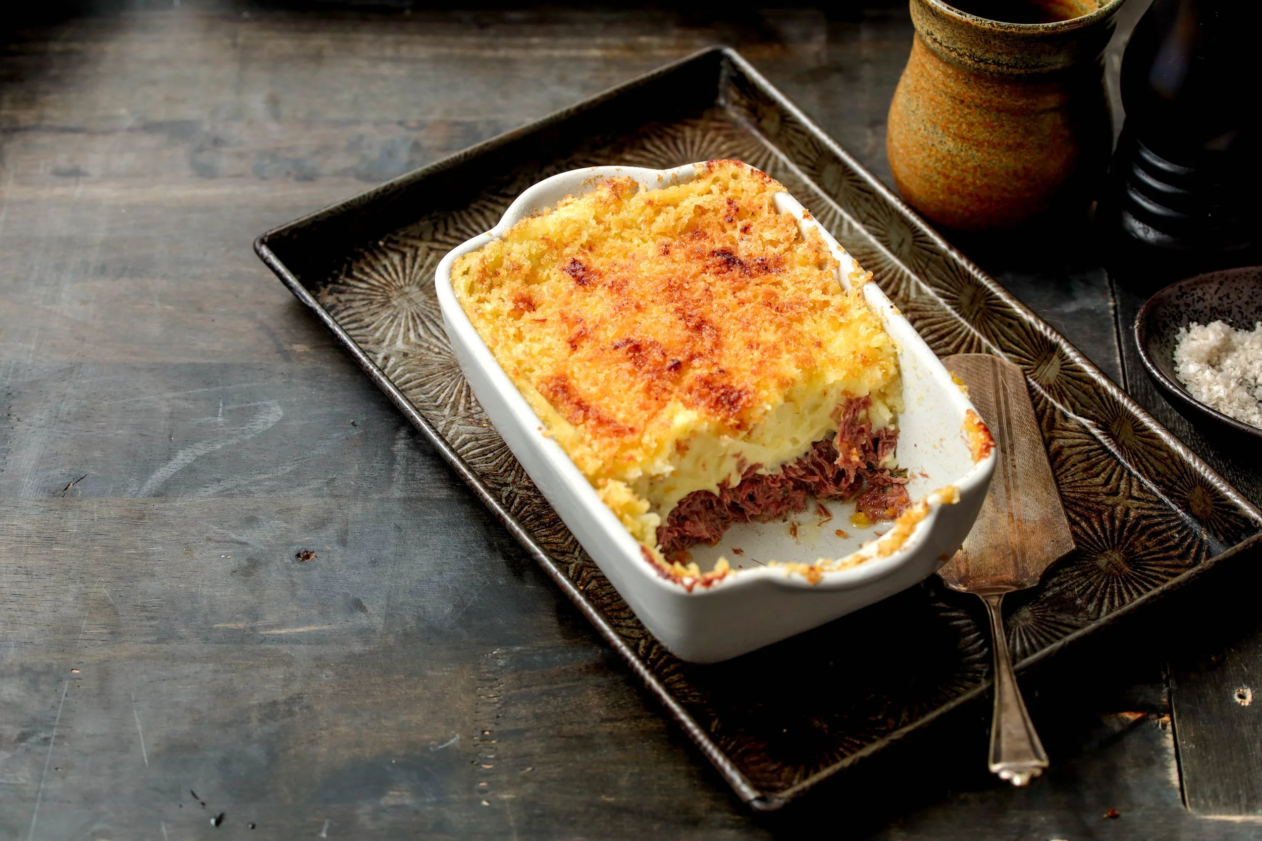 The French answer to the cottage pie. Leftover pot-au-feu beef given new life, layered with creamy pommes purée and baked until golden. Classic comfort, nothing wasted.