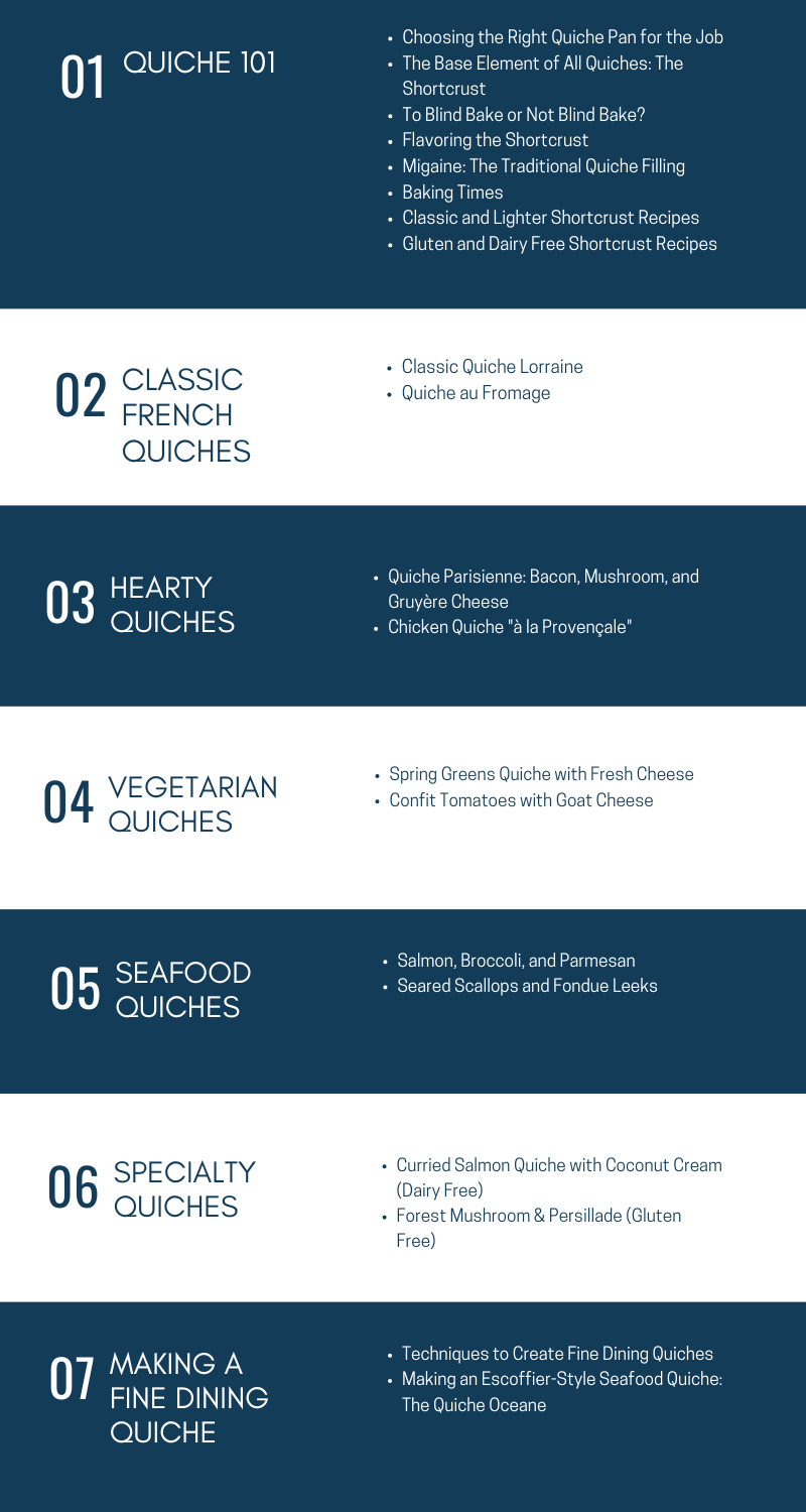 7 Comprehensive Units covering every quiche style—from hearty and vegetarian to seafood and specialty varieties.