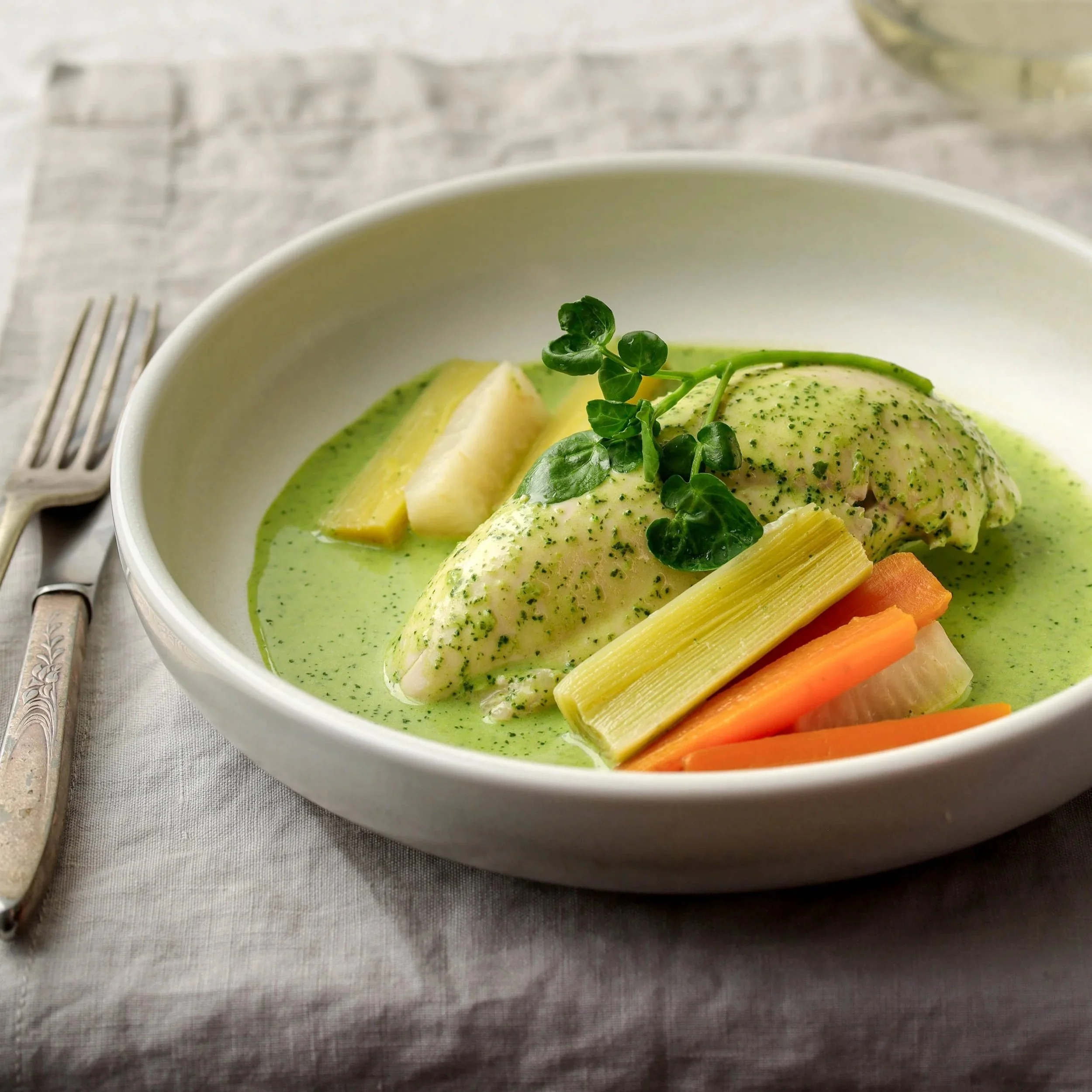 What I love about this dish is its elegant simplicity. The chicken is gently poached in stock using the French method of cooking by concentration - starting in boiling liquid to seal in flavour and moisture. The sauce is made from the reduced cooking broth, a touch of cream, and a vibrant watercress compound butter that brings a beautiful garden-fresh flavour to the plate. It’s the kind of recipe where every element has a purpose, and the result is far greater than the sum of its parts.