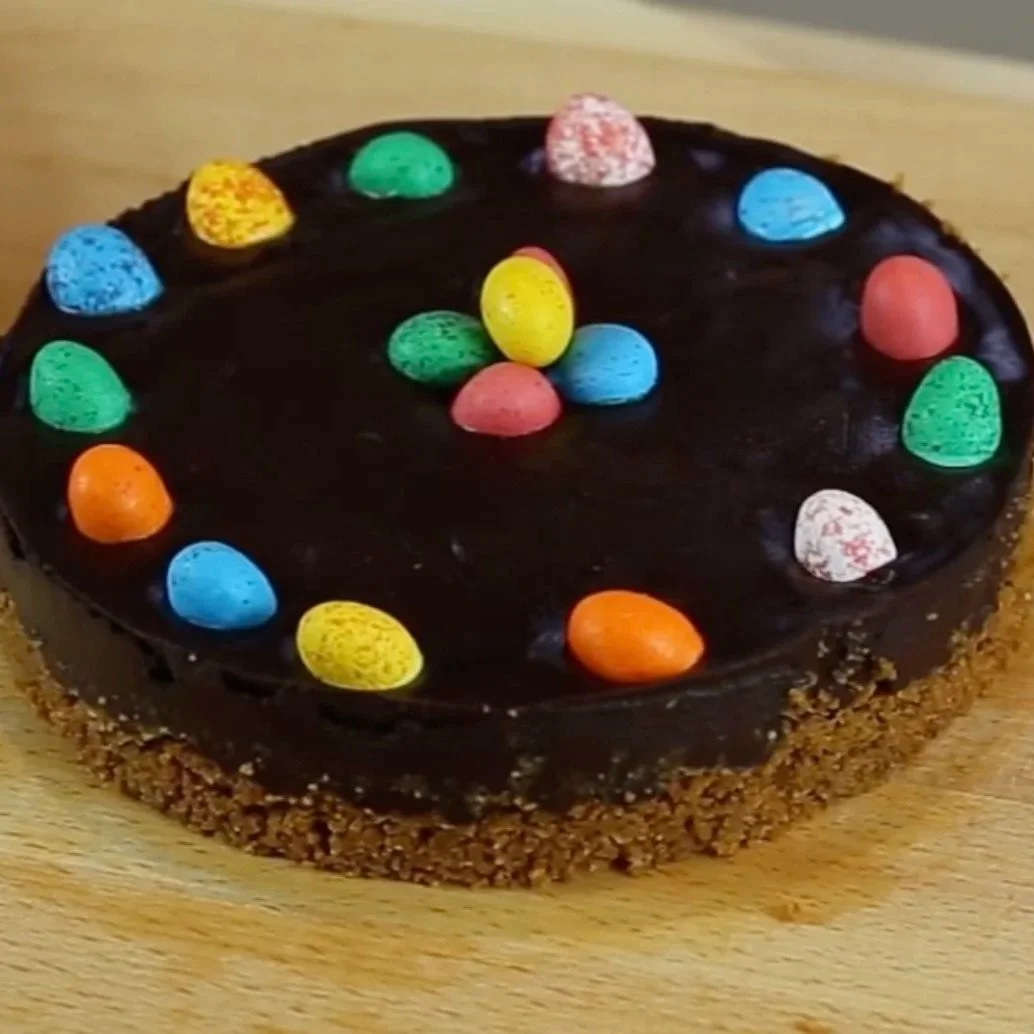 Chocolate ganache tart made with just a handful of ingredients is one of those recipes that consistently surprises people.Chocolate ganache tart made with just a handful of ingredients is one of those recipes that consistently surprises people — not because it is complicated, but because it is so good. The base is crushed caramelised biscuits bound with butter, pressed into a tart ring and chilled until firm. The filling is a classic ganache: hot cream poured over dark chocolate and left to melt into a glossy, silky sauce. No oven, no fuss. Dressed up with a few colourful Easter eggs pressed in before it sets, it becomes exactly the kind of thing you want to bring to the table at this time of year.