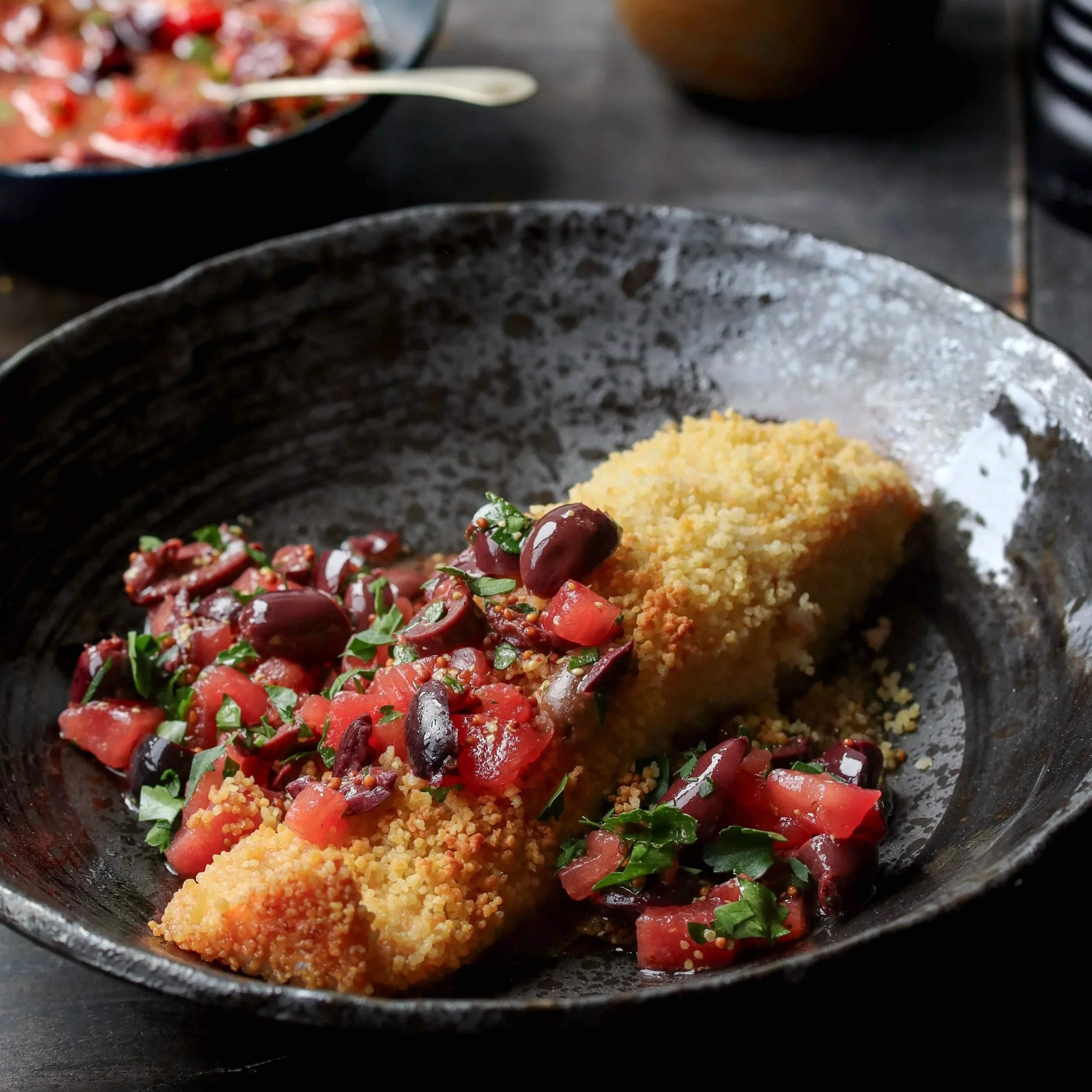 Baked until golden brown and served with a Mediterranean-style tomato, olive & parsley salad with vinaigrette.