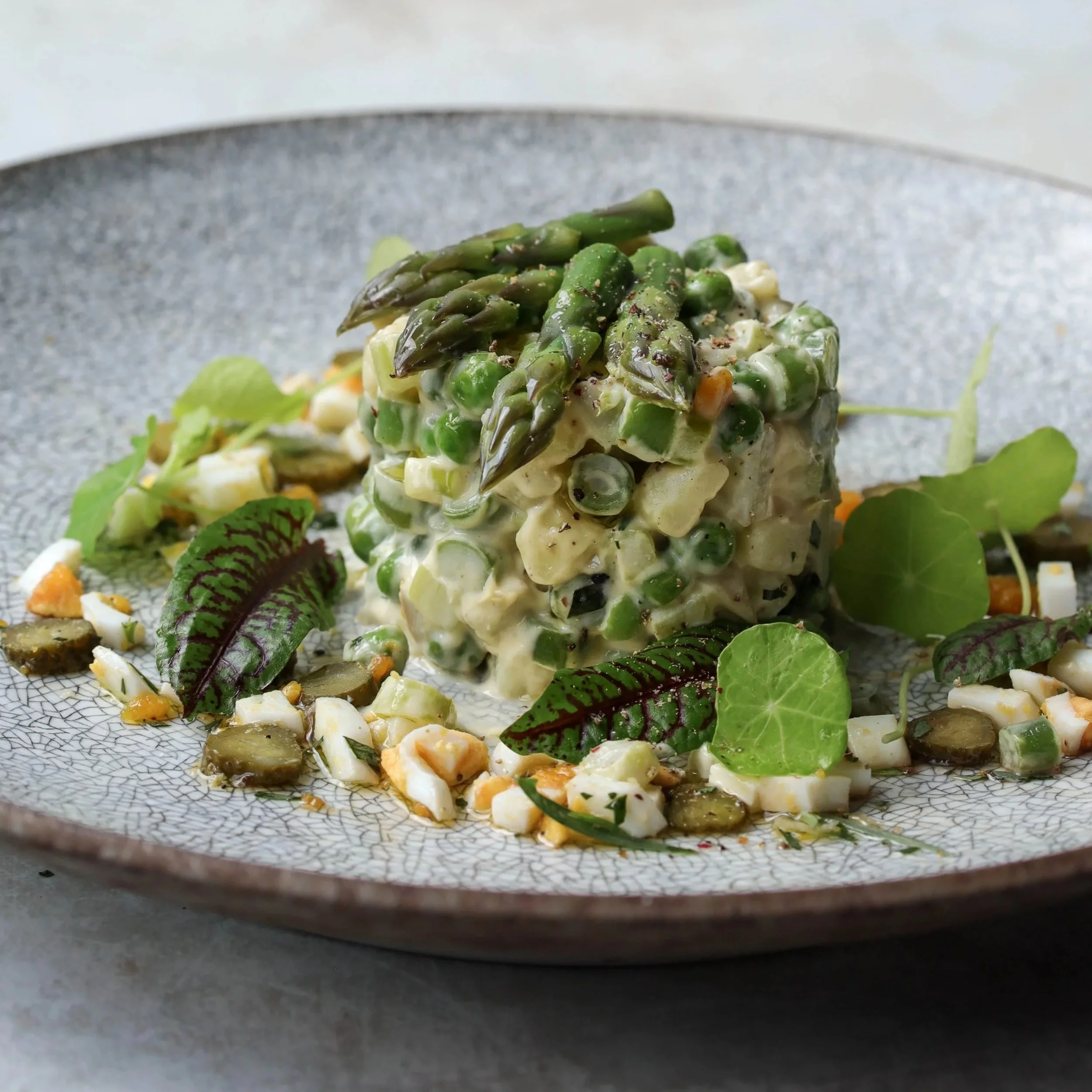 Salade Saint-Jean. This elegant version highlights mostly green vegetables, lightly coated in a tangy mayonnaise, and presented with a garnish of chopped hard-boiled egg, gherkins, and a touch of fresh tarragon. This our video tutorial we explore Escoffier’s Guide Culinaire for a solid understanding of this style of salad. Watch for all the necessary steps to create this fresh, sophisticated salad. It’s perfect for a starter it will please all green vegetable lovers.