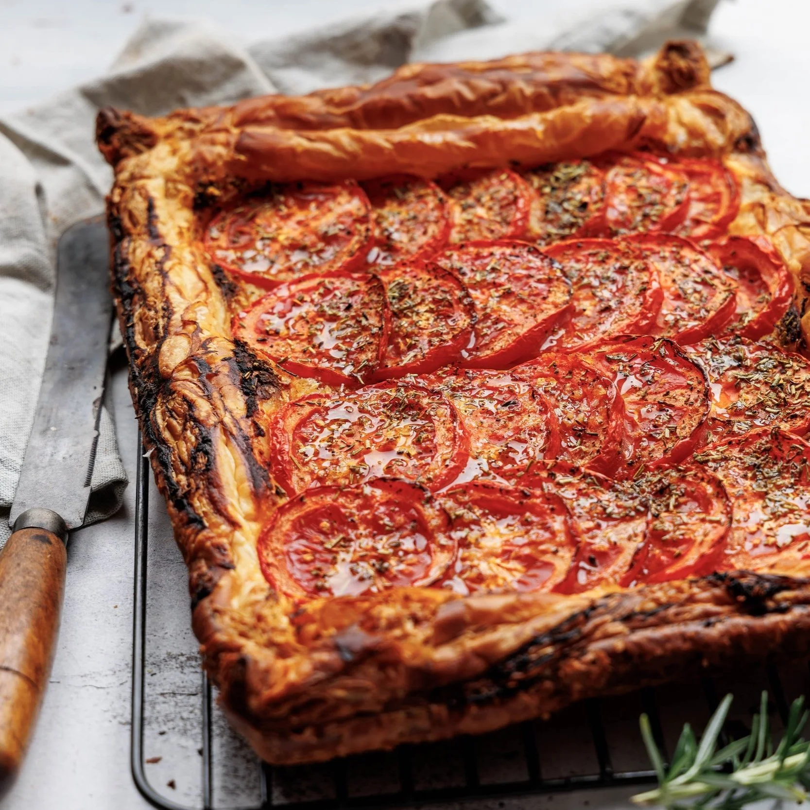 When friends are coming over for a spontaneous aperitif, this puff pastry tart is my go-to recipe. It’s quick and easy and will be devoured by guests at any type of gathering, from garden party to family lunch on a sunny terrace. What I love most about this recipe is that no tart or pie dish is required. Just roll out the premade puff pastry and top with the condiments, herbs and juicy ripe tomatoes. It’s like a slice of Provence on your plate.